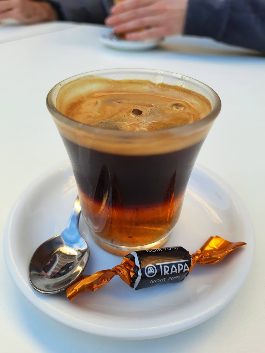 The space is thoughtfully divided into four distinct seating areas: a chic indoor zone, a covered outdoor carpa, sunny tables that wrap around the corner, and open-air spots directly opposite the main entrance. This layout caters well to different moods and weather — whether you want a relaxed coffee break shielded from the sun or a lively drink outside on a bright afternoon.